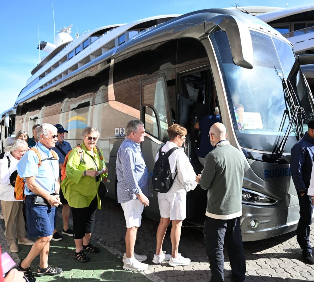 Las autoridades realizaron la entrega de obsequios que representan la producción vinícola del país. Los pasajeros del crucero desarrollan diversas visitas este martes a bodegas y estancias con la posibilidad de ver tareas rurales y degustar platos típicos del Uruguay.