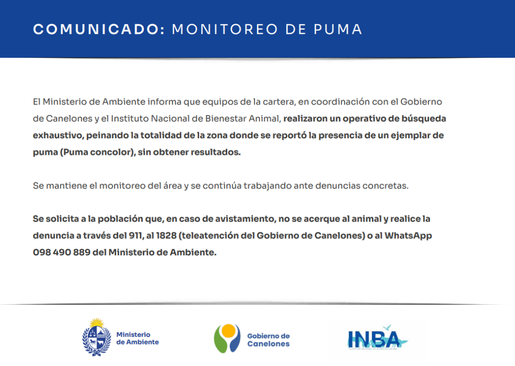 El Ministerio de Ambiente informó este lunes que continúa el monitoreo en la zona donde se denunció la presencia de un puma en el departamento de Canelones, luego de un operativo de búsqueda que no logró localizar al animal.