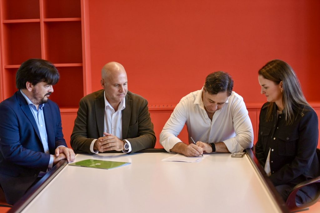 En la firma del convenio participaron el intendente de Canelones, Francisco Legnani; el secretario general, Pedro Irigoin; el CEO de Corporación América Airports, Martín Eurnekian; y la directora general de TUMO Uruguay, Carolina Gutiérrez.