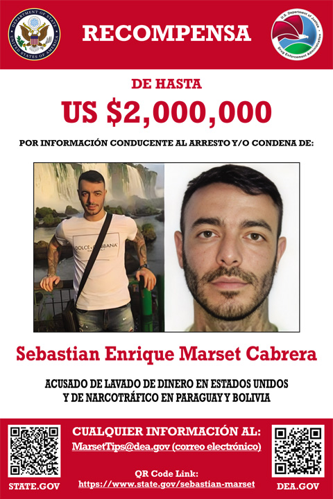 Diversos medios y comunicados oficiales recordaron que Estados Unidos ofrece una recompensa de hasta 2 millones de dólares por información que conduzca al arresto y/o condena de Sebastián Marset.