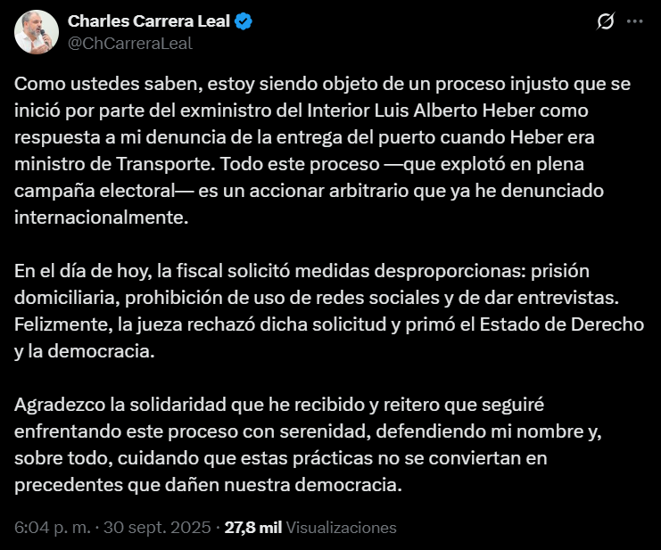 Carrera sostuvo que las medidas solicitadas por Fiscalía eran “absurdas” y reiteró su postura de que se trata de “una causa armada” por Luis Alberto Heber, entonces ministro del Interior cuando se hace la denuncia. Agregó que tuvo un rol central al denunciar la entrega del puerto de Montevideo hasta el año 2081 a la empresa Katoen Natie y que hoy “se está viviendo las consecuencias económicas y jurídicas de esa situación”. Hizo énfasis en que todo lo dicho en 2022 “hoy se está cumpliendo: hay falta de trabajo en el puerto, falta de competitividad y una situación litigiosa”.