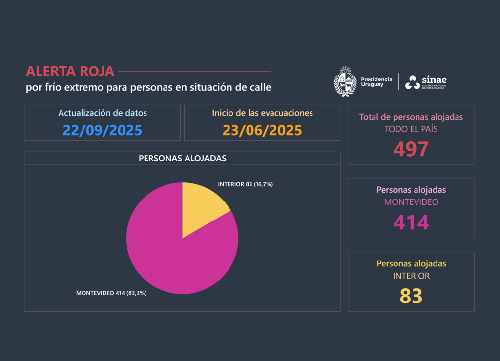 El pasado domingo, 2.764 personas recibieron asistencia, de ellas, 1.948 en Montevideo y 816 en el interior del país. De ese total, 2.267 fueron atendidas en refugios y 497 en centros de evacuación. Además, la Policía realizó 158 traslados en todo el territorio uruguayo para resguardar a personas en situación de vulnerabilidad.